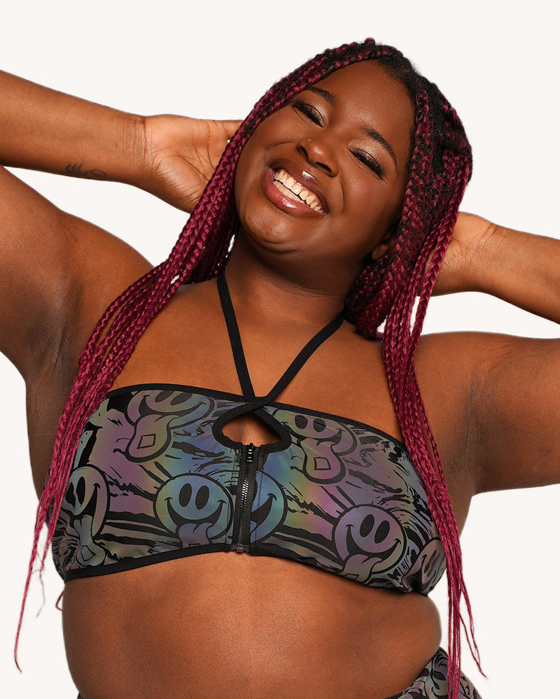 Fit so bright you can light the night! Our iconic happy hour print just got an upgrade in this rainbow reflective cutout top style. Featuring supportive coverage and an adjustable halter tie, your next IG post is going to slayyyy in this fit. Pair with the Happy Hour Rainbow Reflective Cutout Skirt to complete the look.